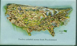 I found out that there were a total of 13 Freedomland postcards of the Hallmark type. There were also some photographic postcards (see the Gallery pages). Here are the ones I've picked up so far. I've also found what was listed as a set of "Twelve colorful scenes from Freedomland" .. but based on the number printed on the back.. something doesn't add up.