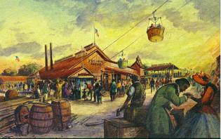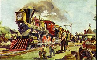 CHICAGO DEPOT - Engine whistles bring a thrill of excitement at Chicago's 1870 depot as Freedomland's excursion trains chug to a stop. Passengers alight from the 'iron horse' after a scenic non-stop trip from San Francisco |